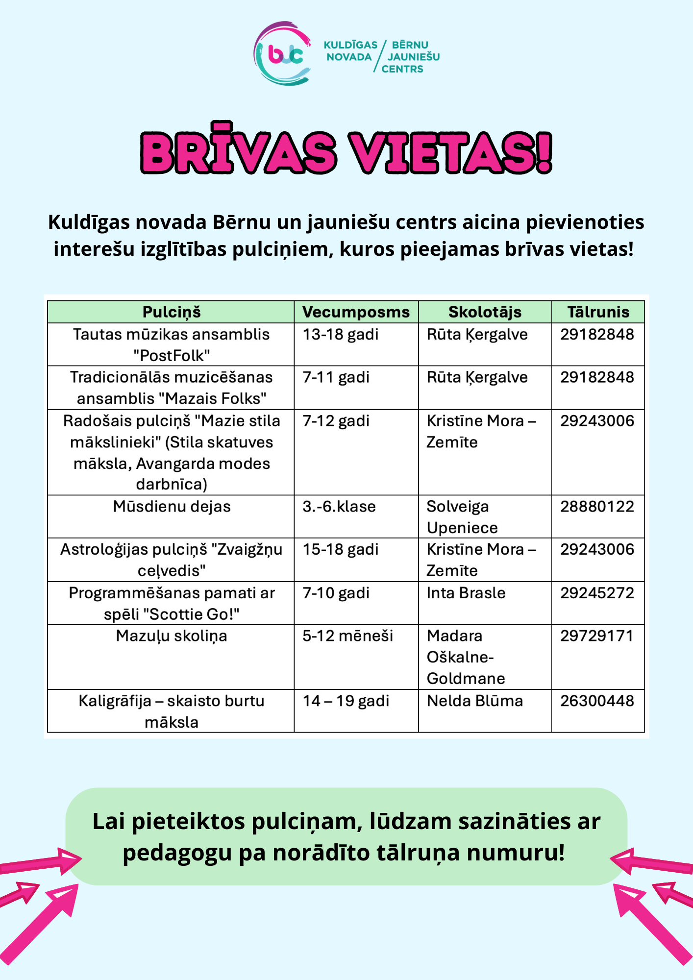 Lai pieteiktos pulciņam, lūdzam sazināties ar pedagogu pa norādīto tālruņa numuru!